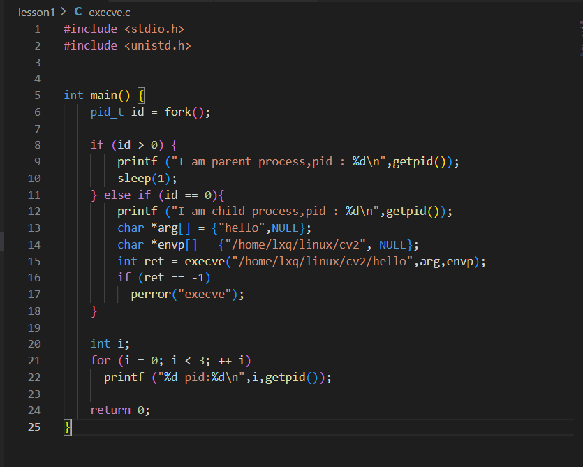 1 #include <stdio.h> 2 #include <unistd.h> 3 4 5 int main() { 6 pid_t id = fork(); 7 8 if (id > 0) { 9 printf ("I am parent process,pid : %d\n",getpid()); 10 sleep(1); 11 } else if (id == 0){ 12 printf ("I am child process,pid : %d\n",getpid()); 13 char *arg[] = {"hello",NULL}; 14 char *envp[] = {"/home/lxq/linux/cv2", NULL}; 15 int ret = execve("/home/lxq/linux/cv2/hello",arg,envp); 16 if (ret == -1) 17 perror("execve"); 18 } 19 20 int i; 21 for (i = 0; i < 3; ++ i) 22 printf ("%d pid:%d\n",i,getpid()); 23 24 return 0; 25 }