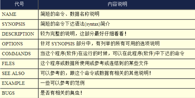 man page的内容也分成好几个部分来加以介绍该命令,以NAME作为开始介绍,最后还有个SEE ALSO来作为结束。基本上,man page大致分成底下这几个部分: