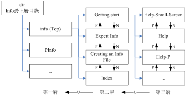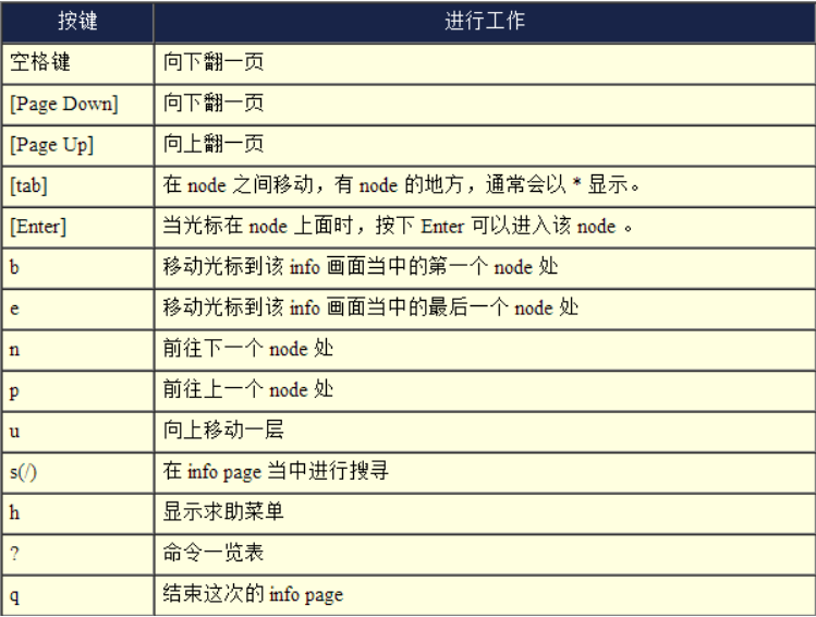 如同上图所示,info的说明文件将内容分成多个node,并且每个node都有定位与连结。 在各连结之间还可以具有类似『超链接』的快速按钮,可以透过[tab]键在各个超链接间移动。 也可以使用U,P,N来在各个阶层与相关链接中显示!至于在info page当中可以使用的按键,可以整理成这样: