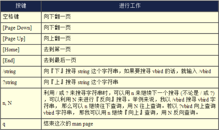 大致上了解了man page的内容后,那么在man page当中我还可以利用哪些按键来帮忙查阅呢?首先, 如果要向下翻页的话,可以按下键盘的空格键,也可以使用[Page Up]与[Page Down]来翻页呢!同时,如果你知道某些关键词的话, 那么可以在任何时候输入『/word』,来主动搜寻关键词!