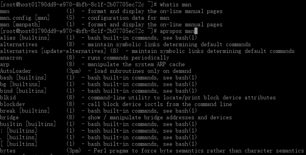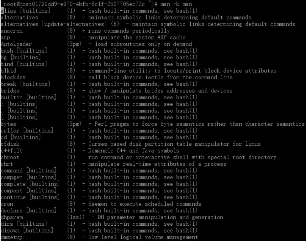 当使用『man -f 命令』时,man只会找数据中的左边那个命令(或文件)的完整名称,有一点不同都不行! 但如果我想要找的是『关键词』呢?也就是说,我想要同时找上面说的两个地方的内容,只要该内容有关键词存在, 不需要完全相同的命令(或文件)就能够找到时,该怎么办? 我们可以使用man -k 这个命令
