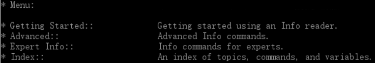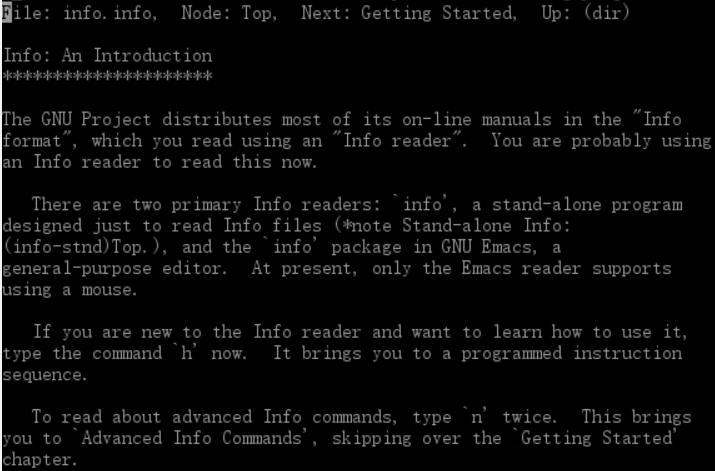 Node:代表目前的这个页面是属于Top节点。 意思是info.info内含有很多信息,而Top仅是info.info文件内的一个节点内容而已;