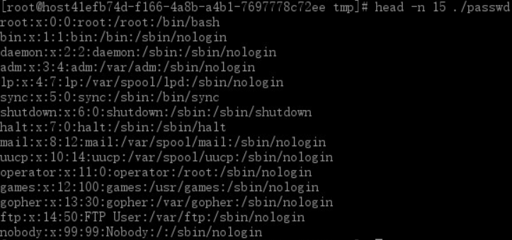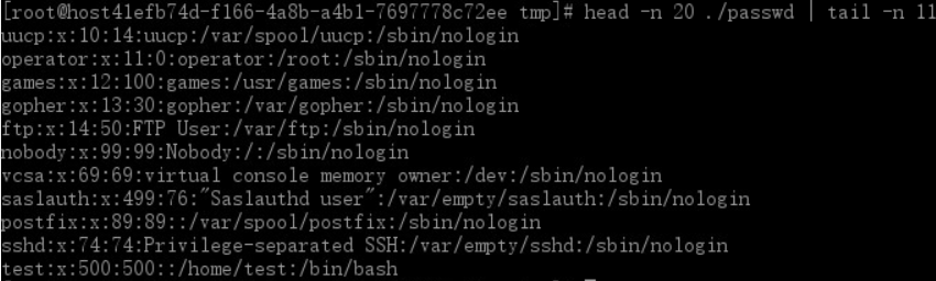 想一想,如果我要选取/tmp/passwd 文件的第10到20行的内容该怎么办呢?我们可以这样做,先选取头20行,然后再取后11行不就行了。那怎么做呢。这里我们就要用到管道命令了。先用 head 选取前20行,然后把输出结果交给tail命令选取后11行内容就行了。