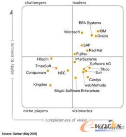 笔者将其分为三类厂商:第一类主要以中间件产品为主的SOA厂商,第二类是以系统集成为主的SOA厂商,第三类是以ERP、CRM等企业系统为主的SOA厂商。