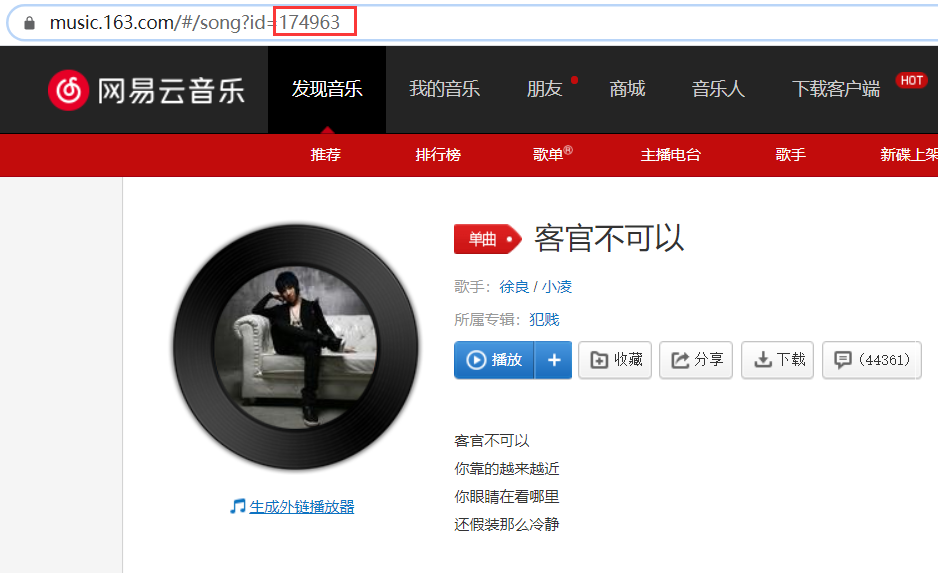 举个栗子:比如下边说这首歌,红色方框内的数字,先复制好上边的URL,然后把id替换掉,敲Enter键,最后我们就可以下载了(提示最好先创建一个新页面,删除掉*号,在复制id),不需要开通网易音乐VIP的,回车后得到第二张图可以直接下载,VIP歌曲(如第三张图)会出现404的情况,像图三这种情况别问,问就是穷开不起VIP。