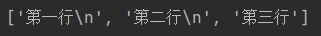 with open(r'a.txt', 'r', encoding='utf8') as f: print(f.readlines()) # 读取文件所有的内容,组织成列表,每个元素是文件的每行内容