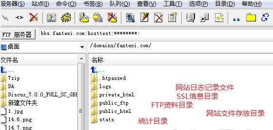 当您进入域名的目录后,一般会包含logs(网站日志目录)、private_html(SSL信息目录)、public_html (网站文件存放目录)、public_ftp(FTP资料目录)、stats(统计目录);