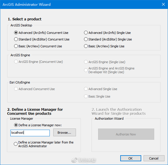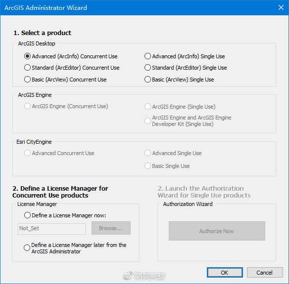 1)选择一种产品,Advanced(ArcInfo)浮动版,