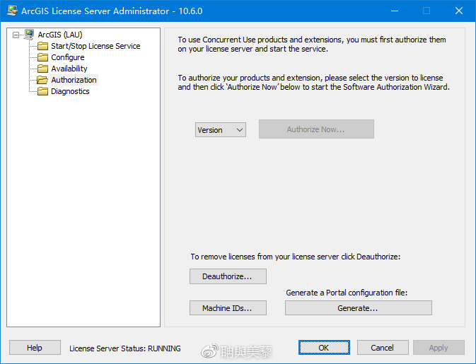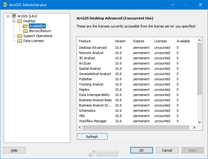 确定后弹出ArcGIS许可管理器(ArcGIS Administrator),点击可用性Availability→刷新Refesh;