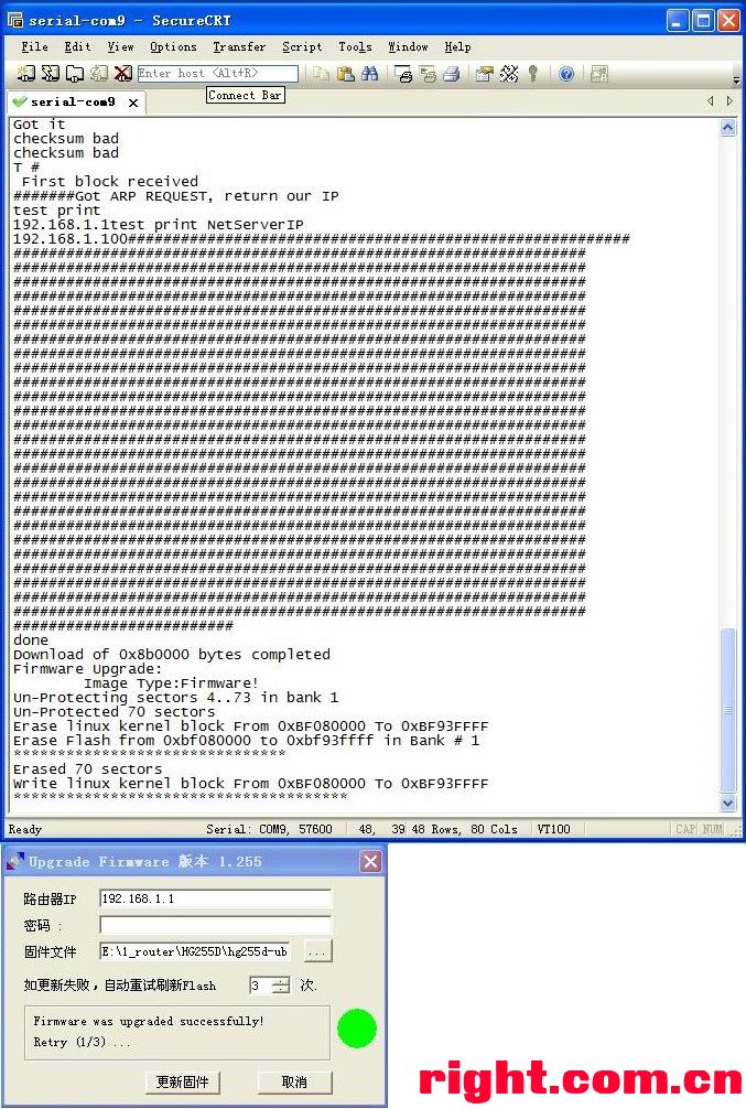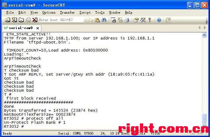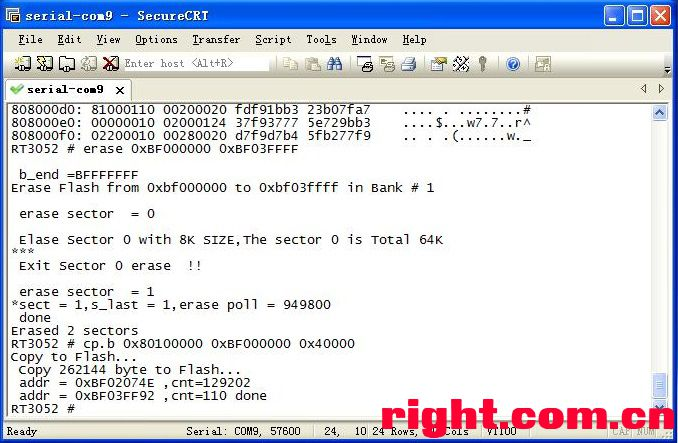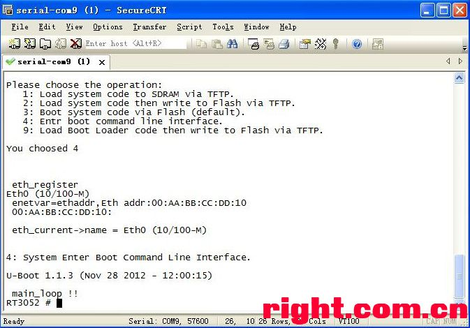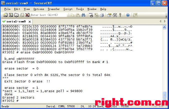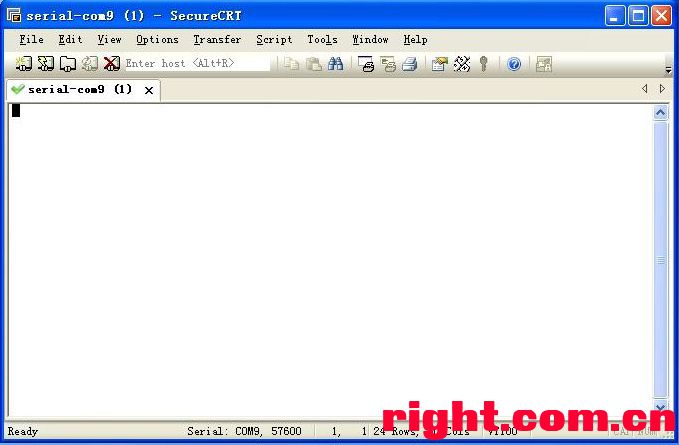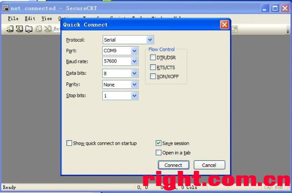 设置SecureCRT里(Protocol:Serrial Port:COM9 Baud rate:57600 Data bits:8 Parity:None Stop bits:1)