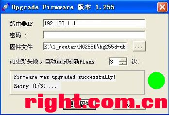 先将HG255D断电,运行tftp软件,选择要刷的固件,按住reset键不松接通电源,5秒种后会进入刷机模式,点击tftp上的“更新固件”,等那个灰色的圆圈变成绿色就可以了,这里不要太着急,可能要3-5分钟,可以去ping 192.168.1.1 -t ,直到有ping出值来,那样就OK了。