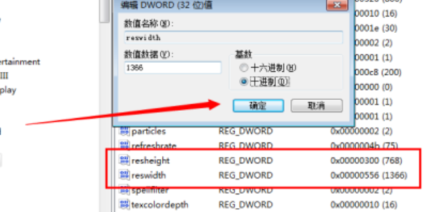 如本例,电脑分辨率是1366X768 那么(“‘resheight”高度就是 768和“reswidth”宽度就是1366啦)点击进行设置修改