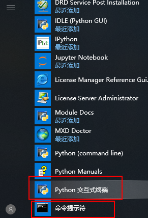 启用Python3.6.9需要利用在ArcGIS程序菜单中选择“Python交互式终端”,启用conda环境需要选择ArcGIS程序菜单中选择“命令提示符”。