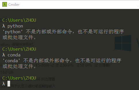 同时使用较多的是用Cmder代替CMD窗口,同样的问题不能直接使用Python和Conda环境。