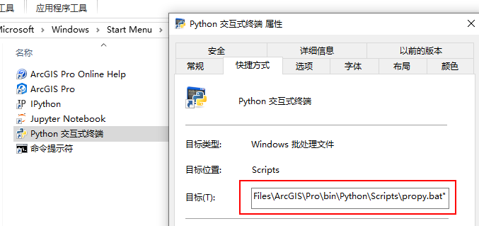 “Python交互式终端”:"C:\Program Files\ArcGIS\Pro\bin\Python\Scripts\propy.bat"