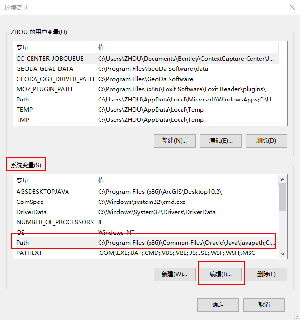 在“环境变量”选择“系统变量”中的“Path”,然后单击下方的“编辑“”