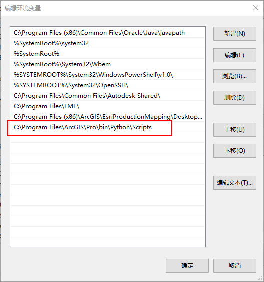 添加conda运行环境,添加一条环境变量信息: C:\Program Files\ArcGIS\Pro\bin\Python\Scripts