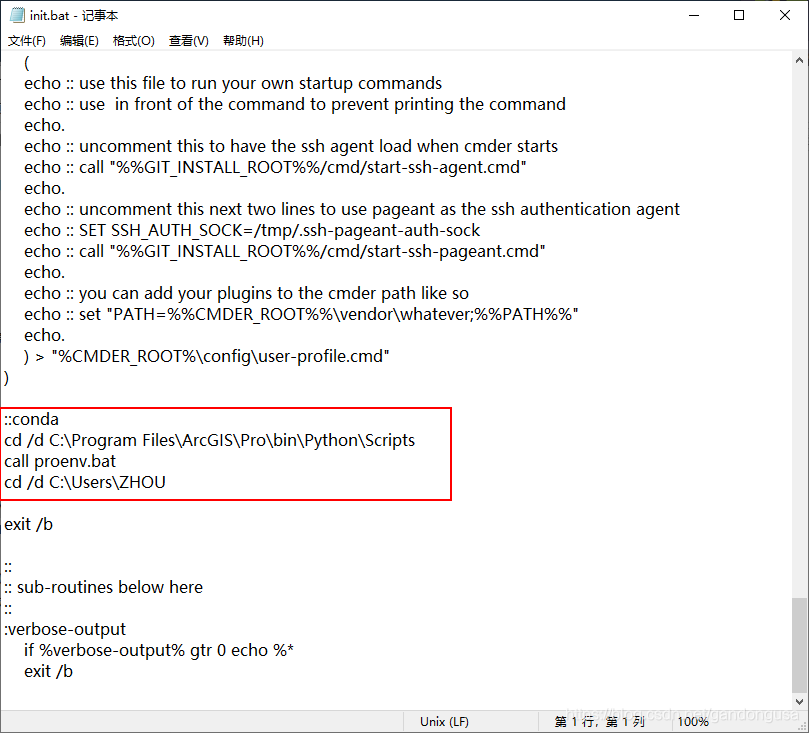 打开Cmder安装文件位置,在下一级目录“vendor”目录下定位到init.bat,在其中添加如下代码: