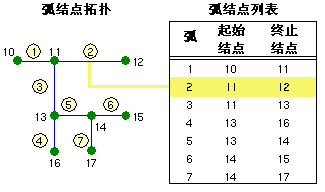 在弧-结点数据结构中,弧段由两个端点定义:指示弧段起始位置的起始结点和指示弧段终止位置的终止结点。这被称为弧-结点拓扑。