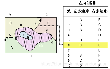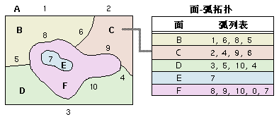 每条弧段都出现在两个面中,下图中,列表中的弧段 6 出现在 B 和 C 中。由于面仅是定义其边界的弧段的列表,弧段坐标只被存储一次,因而可减少数据量并确保相邻面的边界不发生重叠。