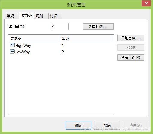 在【目录列表】中拓扑名称上右键单击,选择【属性】,打开【拓扑属性】对话框。在选项卡【要素类】和【规则】中进行要素类的修改和规则的修改。