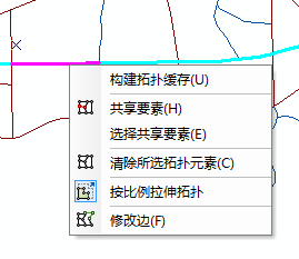 拓扑编辑工具】进行拓扑编辑,在图上选取要素后,拓扑选择要素以高亮红色显示(要素选择以蓝色高亮显示)。在选取的拓扑要素上右键单击就可以调出快捷菜单,选择相应的选项就可以操作了。