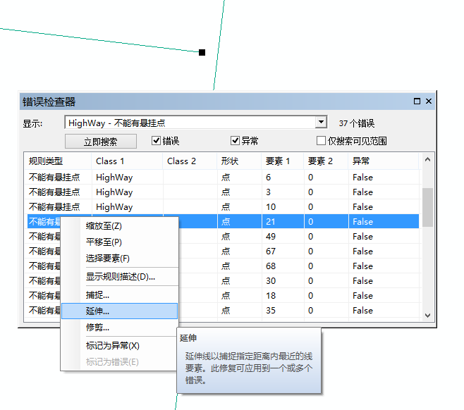 (4)有些情况例如单独一条线段的端点,ArcGIS拓扑不能有悬挂点规则中会把没有与其它线段连接的端点标记为错误,实际这不是错误,需要把这种错误标记为异常。在【错误检查器】中的拓扑错误记录上右键单击选择【标记为异常】,就可以去除该错误。