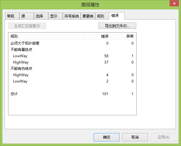 有时需要统计产生的拓扑错误的数量。在拓扑图层上右键单击选择【属性】,打开【图层属性】对话框,定位到【错误】选项卡。单击【生成汇总信息】按钮就可以生成汇总信息,同时还可以利用【导出到文件】功能导出到单独的Text文件。