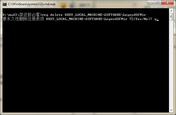 第二步运行本文件夹清理LoginSvr和DBSvr注册表信息.bat文件,弹出的cmd窗口输入 y 回车即可。(如果你的机器以前没有架设过传奇3SF,此步骤可以忽略,新人建议清理一次)
