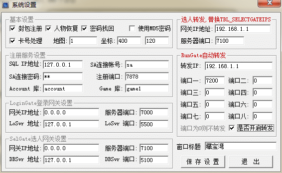 D:Mud3Mir3Server3Gates3Gates.exe 打开程序设置-系统设置,右侧有红字标有的两个地方: 选人转发、Rungate自动转发,