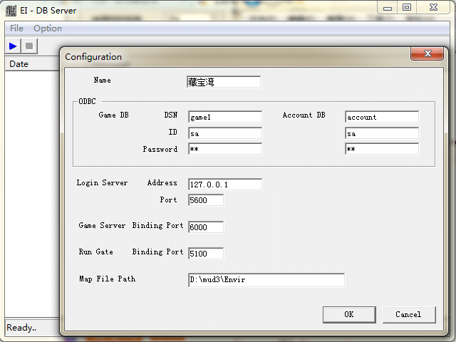 D:Mud3Mir3ServerDBSvrDBSvr.exe 点击option-configuration将name修改为你的区名,如图