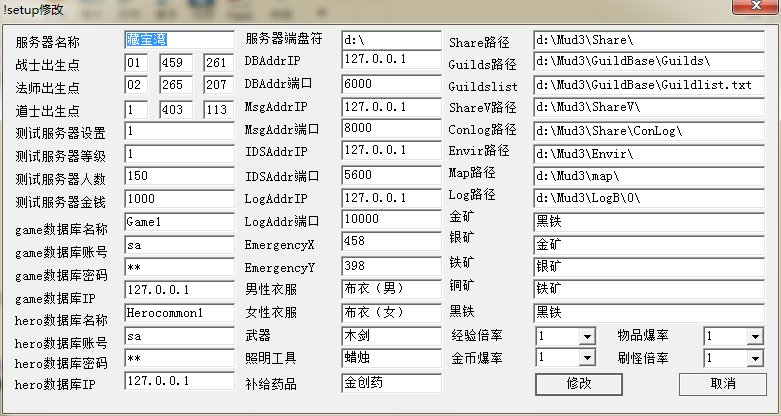 D:mud3Setup!setup修改工具.exe 服务器名称修改成你的区名,ip不要改。可以在这里修改下经验和爆率的倍数。怪物倍数建议默认,其他的倍率建议不要大于128。