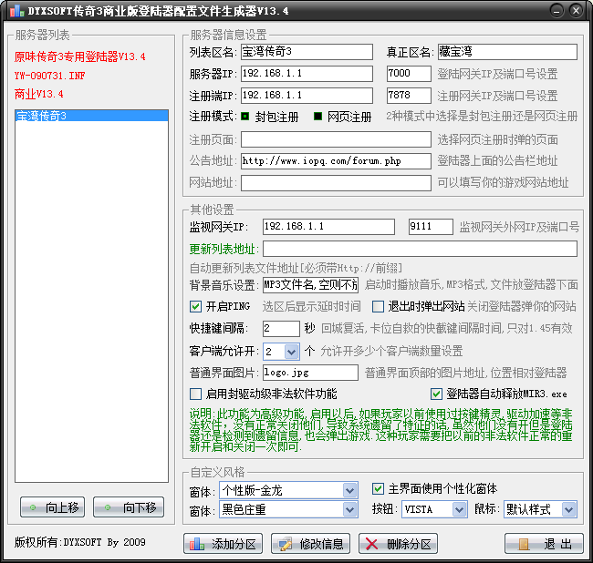 将里面的单机ip改成主机局域网ip,列表区名随意填写,真正区名填写你刚刚修改数据库时的区名,然后点击修改信息按钮即可。