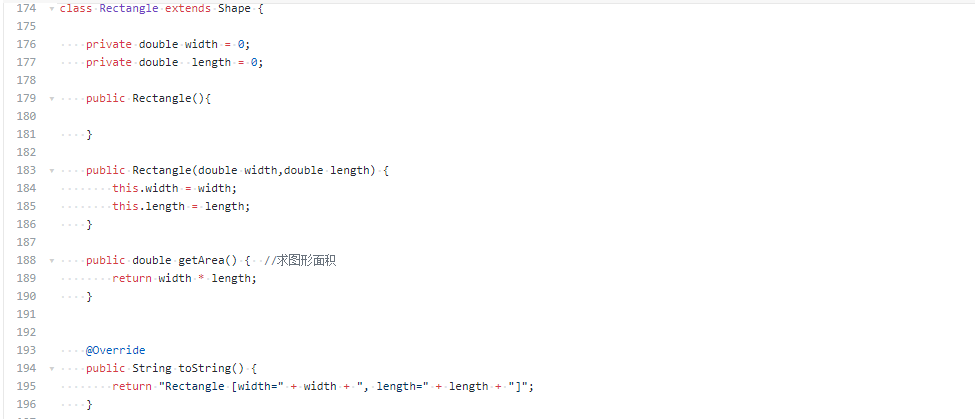 构造器(183-186),求图形面积(188-190),重写父类object方法tostring以便后来进行输出(193-196),判断是否合法(198-203)。