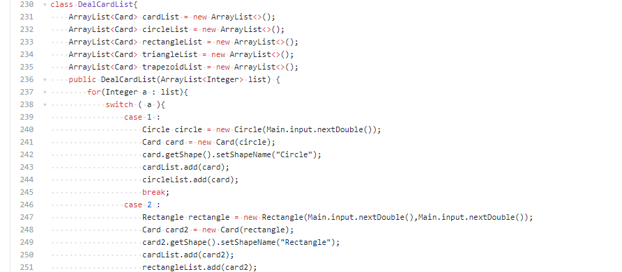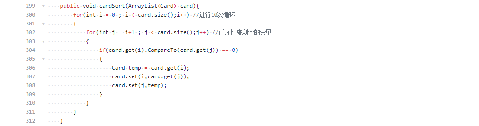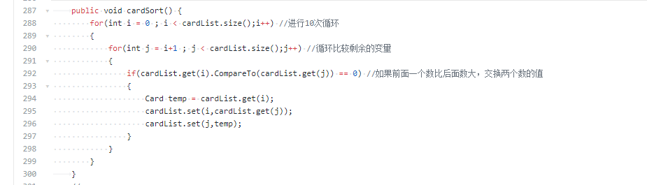 我挑核心代码讲,构造器(242-270)都是大量重复的代码。排序的方法(287-300),一个冒泡排序法使得ArrayList里面的card都是有序的。接下来,按序输出就可以了。