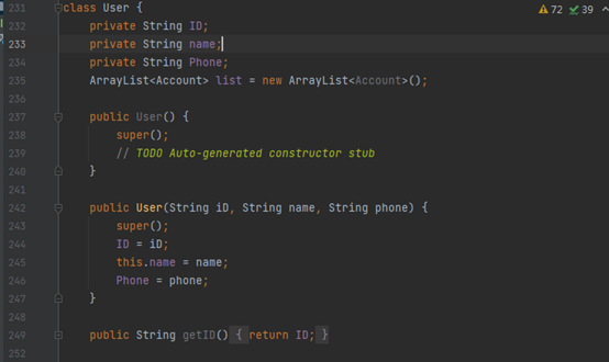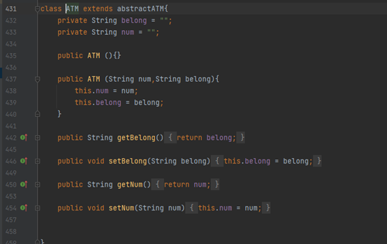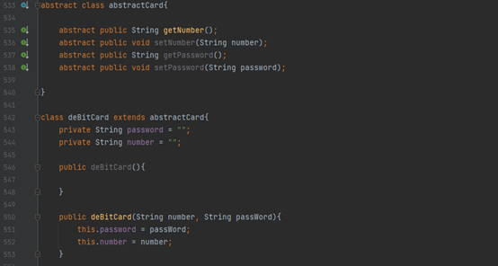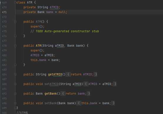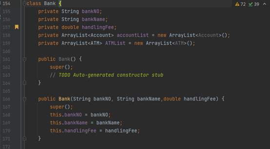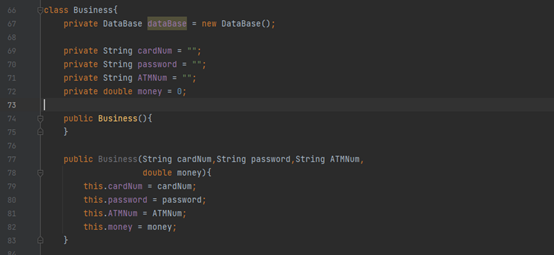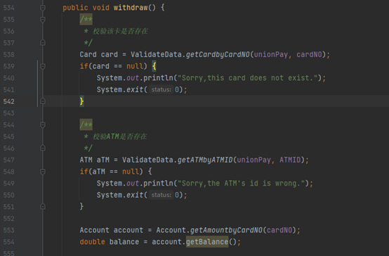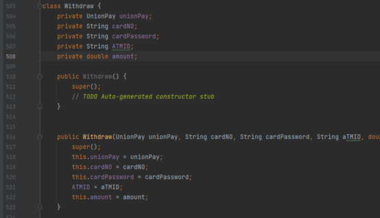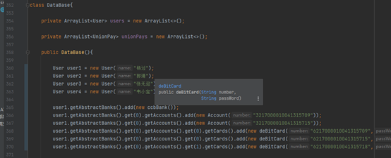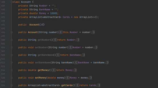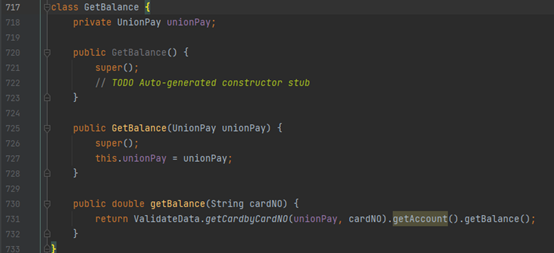 这是很妙的,构造器的妙用,可以在构造类的时候运行,使代码更加简洁。在第538行的使用卡号得到card在前面validatedata进行了详细的分析。553,行,利用卡号得到账户,在类Account中详细分析了。