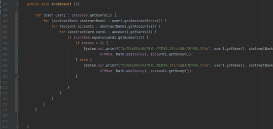 最大圈复杂的在204行,方法是showResult(),因为它是遍历用户,账户,卡再加了一个判断。
