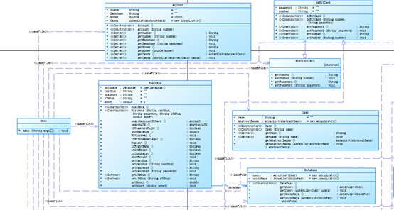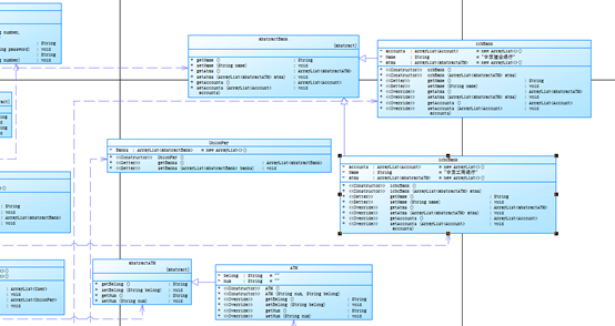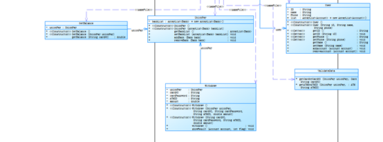 我们应该注意的是,card本应该只有卡号和密码的属性,但是现在加上了账户属性为什么card的属性为什么不是账户呢?,但其实你那里可以直接得到卡呢?卡那么多张,真要找到卡,还得看account,所以属性是银行就可以理解了。