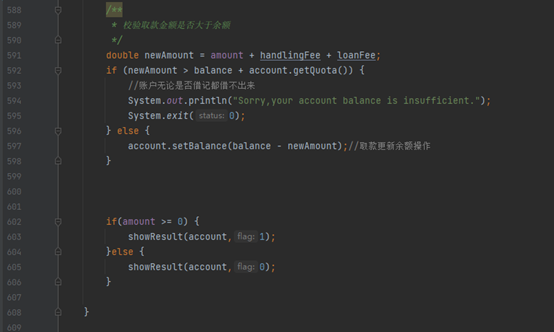 在第588到598行进行了贷款是否超出的校验。我将可以取款理解为目前账户余额和可以透支余额的和为最大可取出的钱。只要这个数值小于取出的钱加上各种手续费,那么就是合法的。