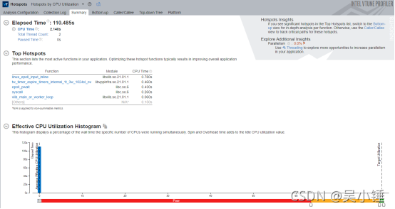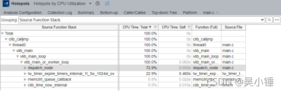 热点(Hotspots)专注在一个具体的可执行文件,识别消耗cpu时钟最多的函数,可以直观的展示程序的线程信息及每个函数的调用栈信息。