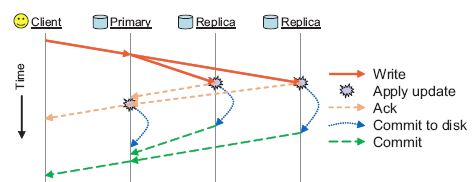 Ceph的读/写操作采用Primary-Replica模型,客户端只向Object所对应OSD set的Primary OSD发起读/写请求,这保证了数据的强一致性。当Primary OSD收到Object的写请求时,它负责把数据发送给其他副本,只有这个数据被保存在所有的OSD上时,Primary OSD才应答Object的写请求,这保证了副本的一致性。