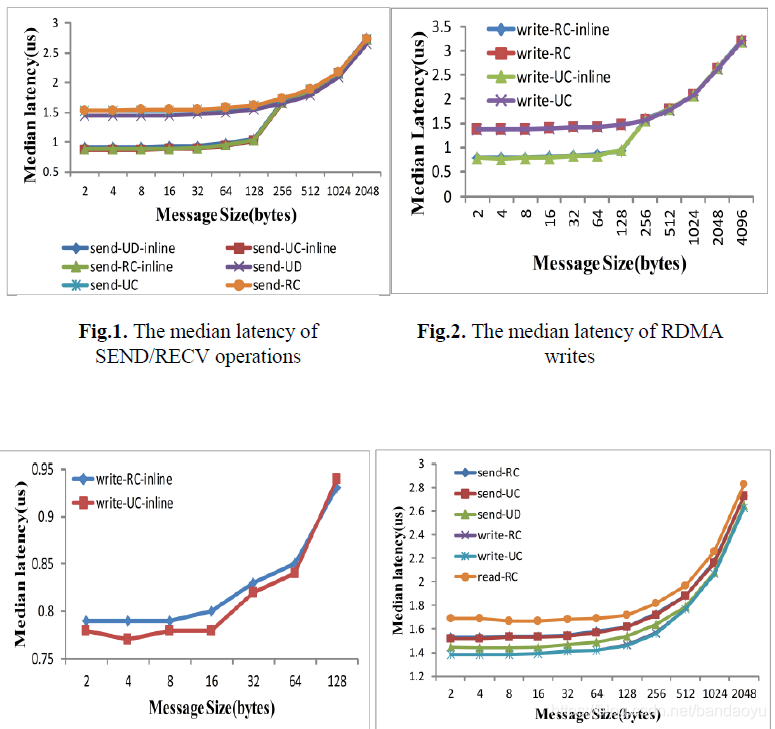 图2表明,与SEND / RECV操作相似,在传输小消息时,使用inlined的RDMA write在RC传输和UC传输上具有较低的延迟。