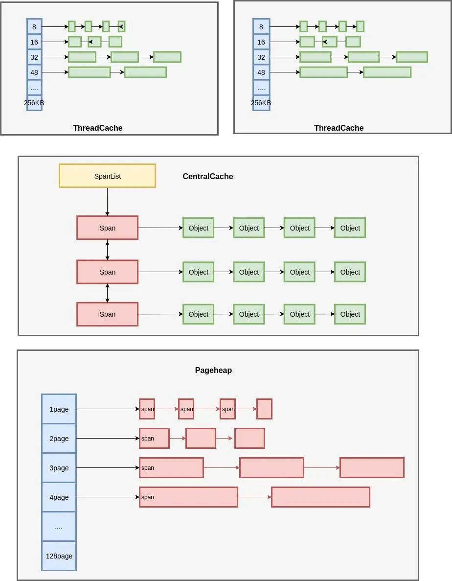 Page Heap(小/大对象):全局页堆,所有线程共享。对于小对象,当centralcache为空时,会从page heap中申请一个span;当一个span完全空闲时,会将该span返还给page heap。对于大对象,直接从page heap中分配,用完直接返还给page heap。
