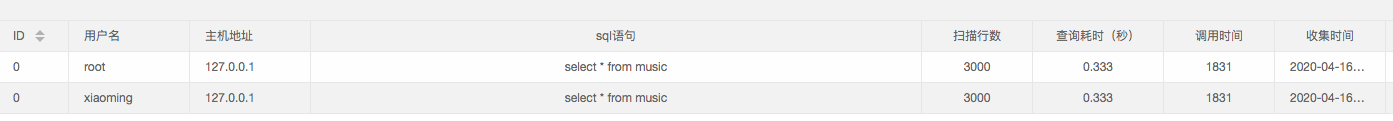 insert into mysql_slow_log (user_name, host, sql, rows_examined, exec_time, query_time, create_time) values('xiaoming', '127.0.0.1', 'select * from music', 3000, 1587021607, '0.333', '2020-04-16 15:32:17');