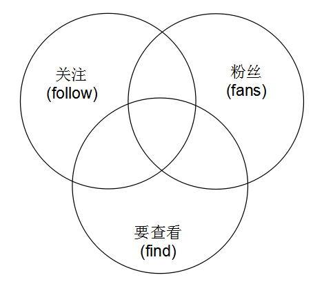 如上图所示。左边的圆表示用户的关注列表,右边的圆表示粉丝列表,下边的圆表示的是要查看的列表(集合)。分别用follow, fans, find来表明这三个集合。