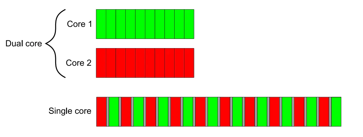 假设A和B两个任务都被分成10个大小相等的块,单核CPU交替的执行两个任务,每次执行其中一块,其花费的时间并不是先完成A任务再玩成B任务所花费时间的两倍,而是要更多。这是因为系统从一个任务切换到另一个任务需要执行一次上下文切换,这是需要时间的(图中的灰色块)。上下文切换需要操作系统为当前运行的任务保存CPU的状态和指令指针,算出要切换到哪个任务,并为要切换的任务重新加载处理器状态。然后将新任务的指令和数据载入到缓存中。