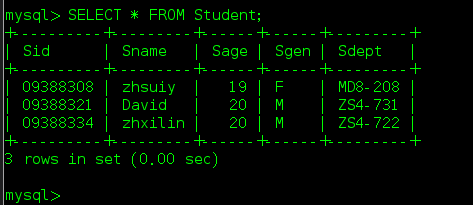 INSERT INTO `student` VALUES ('09388308','zhsuiy',19,'F','MD8-208'),('09388321','David',20,'M','ZS4-731'),('09388334','zhxilin',20,'M','ZS4-722');