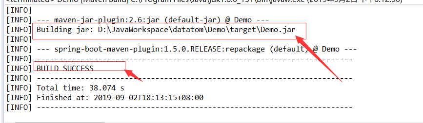 注:执行的时候初次打包可能需要时间下载jar包,时间会长一点输出也会比上图多,但是当你看到BUILD SUCCESS时表示你已成功打成jar,jar包地址为上图红色部分。