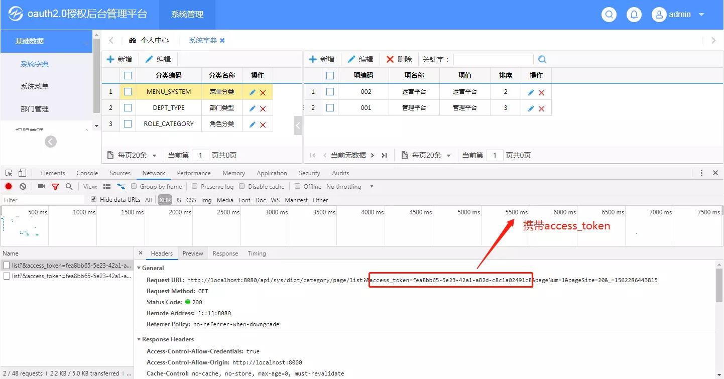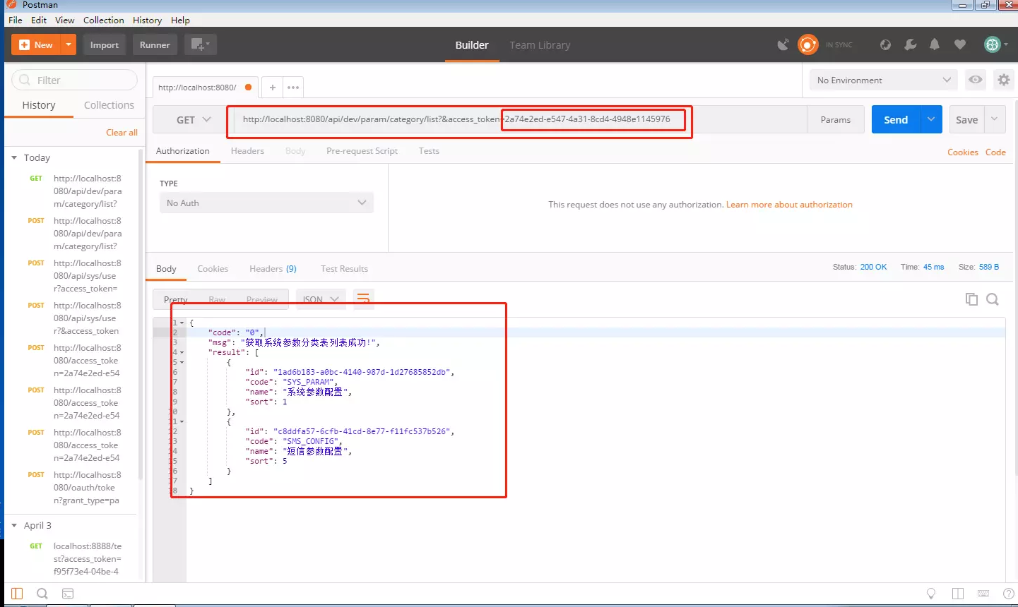 我这边随便一个接口地址拼接access_token去请求系统的接口 请求链接:http://localhost:8080/api/dev/param/category/list?&access_token=2a74e2ed-e547-4a31-8cd4-4948e1145976