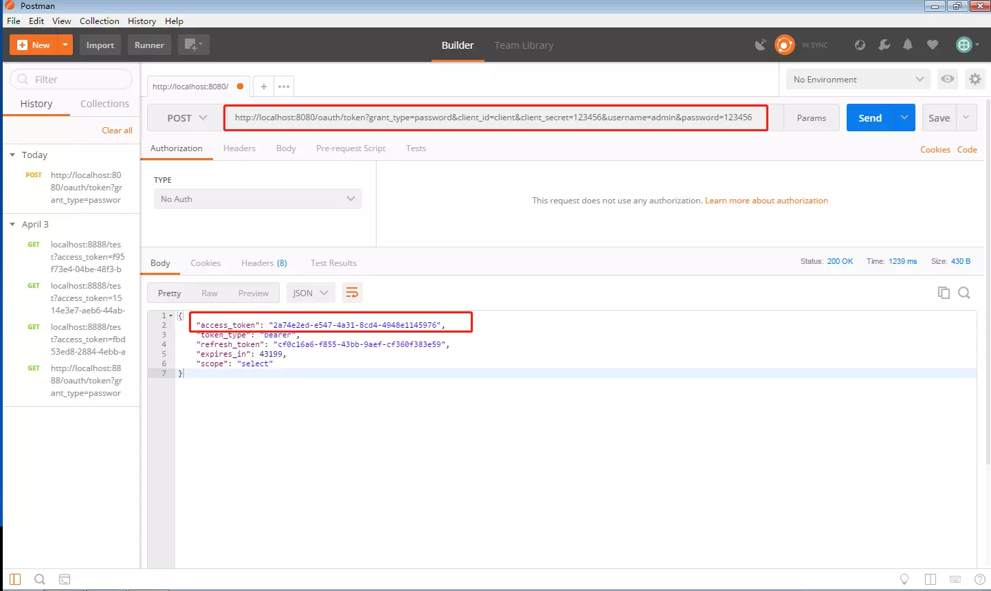 3.client_secret:请求中加一个client_secret参数来对客户端进行认证,这边是用"123456".